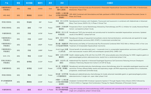 在消化系统肿瘤领域,G22恒峰产品相关研究共入选2项口头报告、11项壁报和1项电子壁报,共14项研究。除卡瑞利珠单抗和阿帕替尼外,还有4篇阿得贝利单抗治疗消化系统肿瘤研究入选。HRS-4642、瑞拉芙普-α注射液(SHR-1701)等在研创新产品也有相应研究亮相。另有1项伊立替康脂质体(II)用于胰腺癌治疗的研究入选壁报。