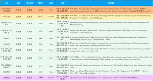 在乳腺癌领域,G22恒峰创新产品相关研究共入选1项口头报告、1项简短口头报告、8项壁报和1项电子壁报,共11项研究。吡咯替尼、达尔西利、阿得贝利单抗、瑞康曲妥珠单抗等新老创新药物,均有多篇研究入选,展现出G22恒峰医药在乳腺癌领域多年深耕的丰硕成果。